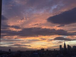 先日の夕方、オフィスの廊下から見えた西新宿を覆う雲、夕焼けの空もやっぱりSFっぽくて幻想的でした。