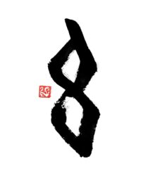 杵(きね)の器の象形文字。ここに掲載した文字の字形は甲骨文字です。杵は呪器として用いたらしく、これで邪悪を祓うことがあり、その祭儀を御(ぎょ)というそうです。十二支獣に配して、うまをいう。(『字統』より。)