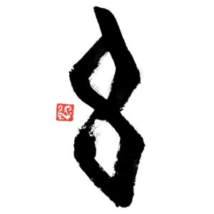 古代文字「午」 杵(きね)の器の象形文字。ここに掲載した文字の字形は甲骨文字です。杵は呪器として用いたらしく、これで邪悪を祓うことがあり、その祭儀を御(ぎょ)というそうです。十二支獣に配して、うまをいう。(『字統』より。
