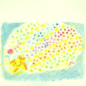 「星のひかり」 まるで、お子ちゃまの色えんぴつ遊び、大変失礼いたします。 明るくて可愛いキャラ、 ライトアニメ!? プレアデスちゃんの大冒険のもう1人の主人公、ほしのヒカリちゃんです。 いつも故郷星のバラを持っていて、ふ